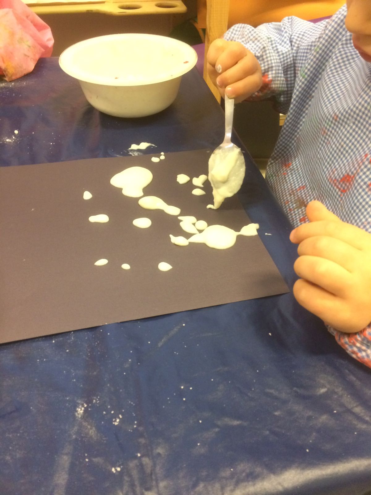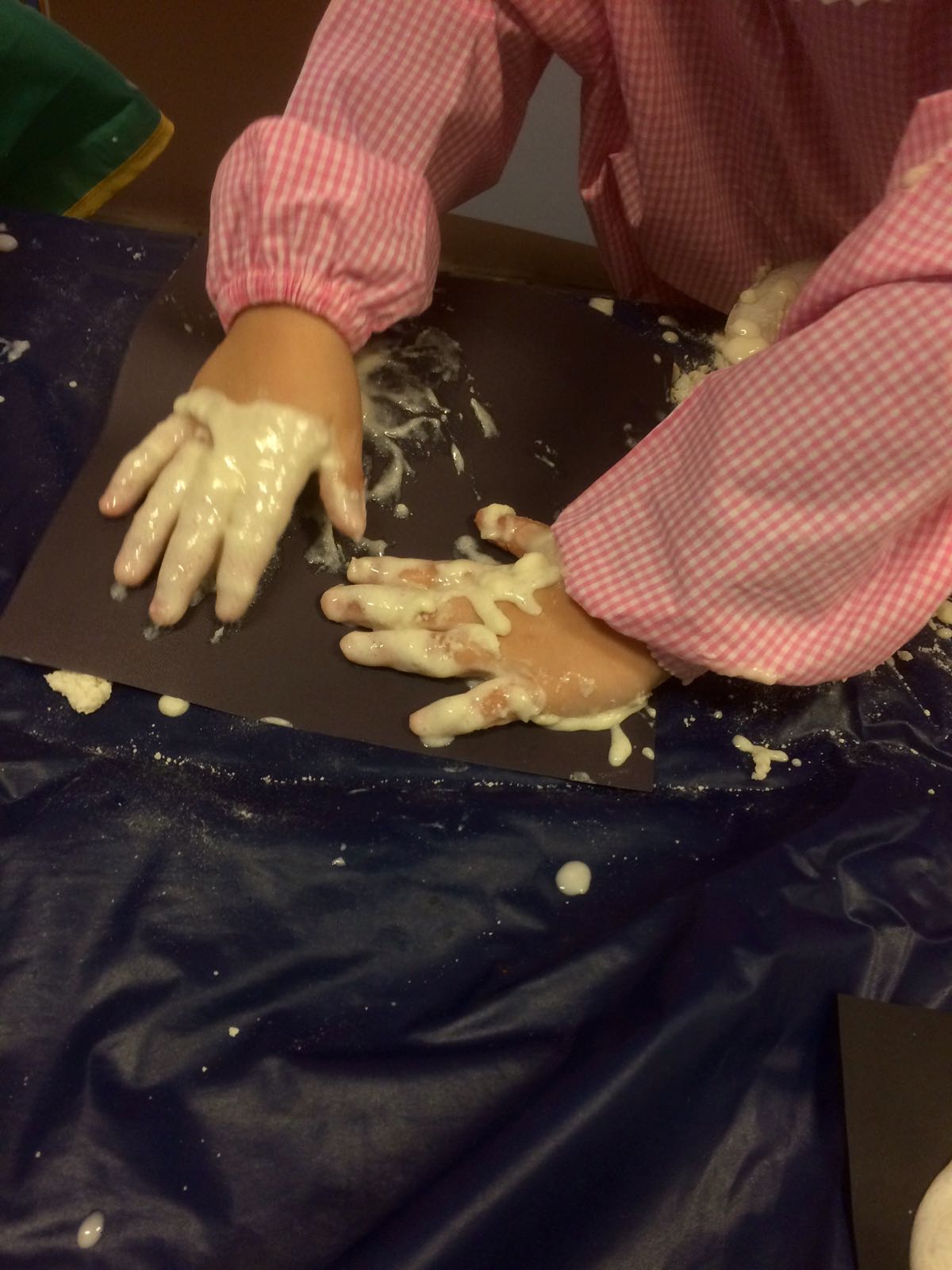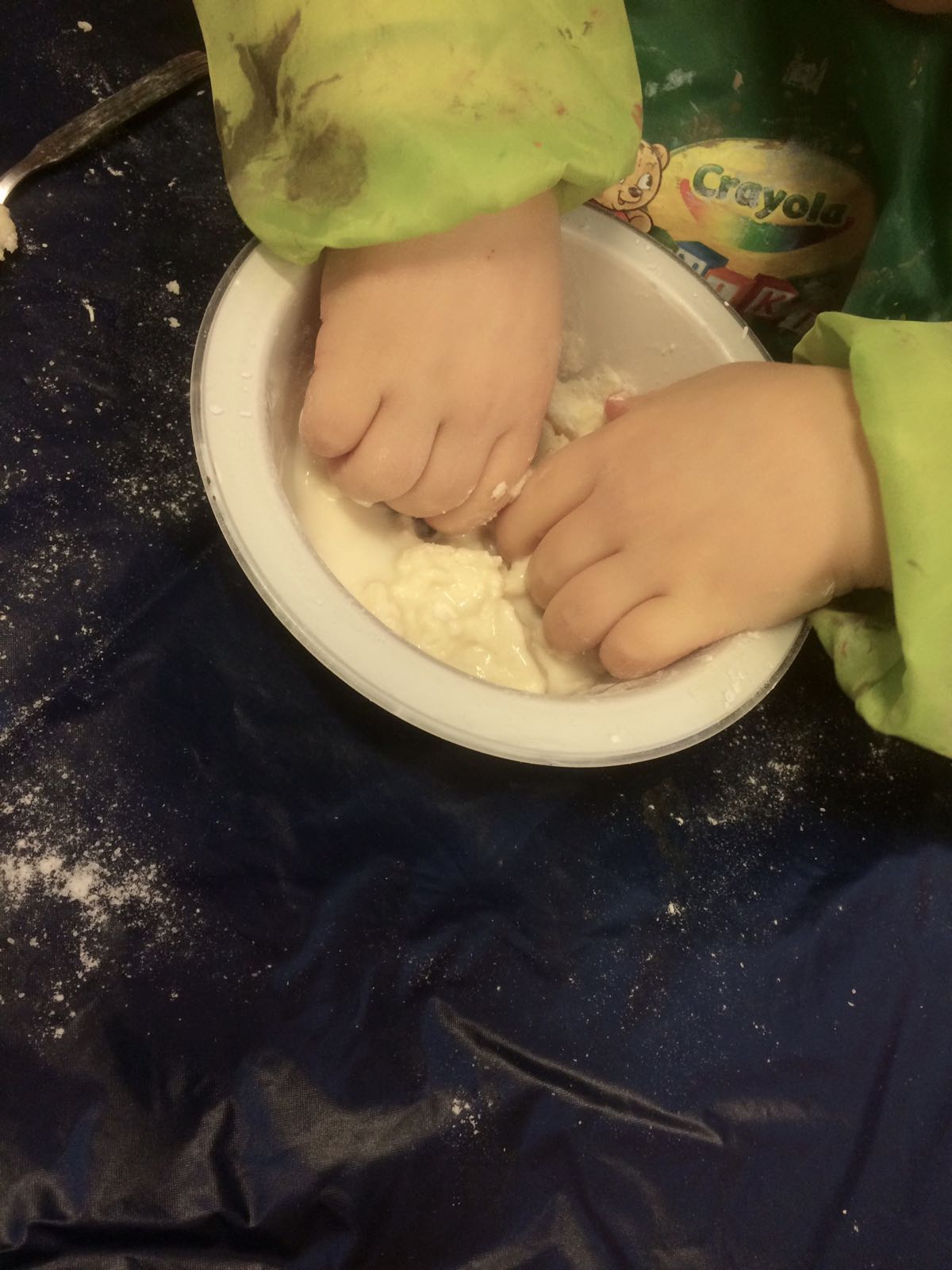 Ogni bambino ha preparato, mescolando nella propria ciotola, un impasto speciale che poi ha utilizzato per creare fiocchi e pupazzi di neve. Tutto questo proprio nel momento in cui fuori nevicava, siamo stati proprio fortunati!!!